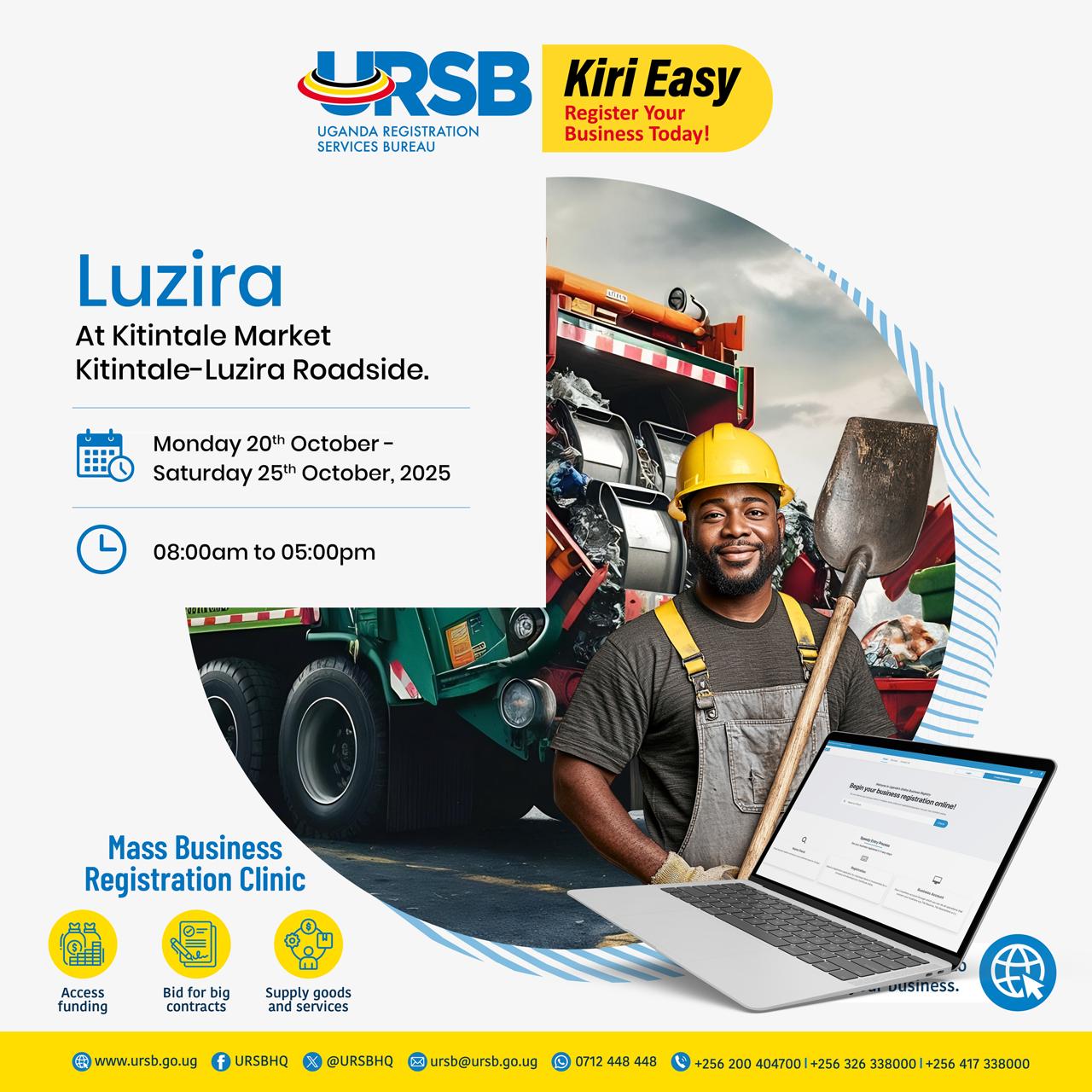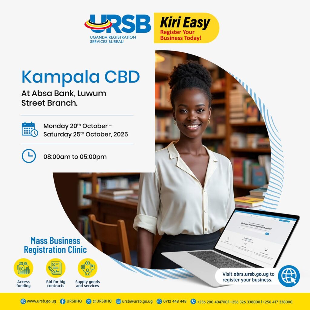 The Uganda Registration Services Bureau (URSB) continues its nationwide mass business registration initiative, with the next phase of registration clinics set to take place in Luzira and Kampala CBD. The clinics in these areas will take place starting Monday, 20th October, to October 25th, 2025.