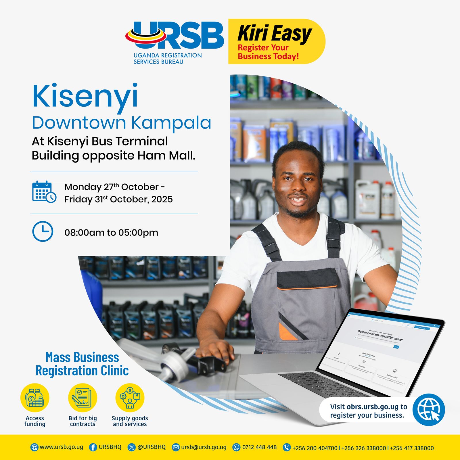 The Uganda Registration Services Bureau (URSB) continues its nationwide mass business registration initiative, with the next phase of registration clinics set to take place in Luzira and Kisenyi, Downtown Kampala. The clinics in these areas will take place starting Monday, 27th October, to October 30th, 2025.