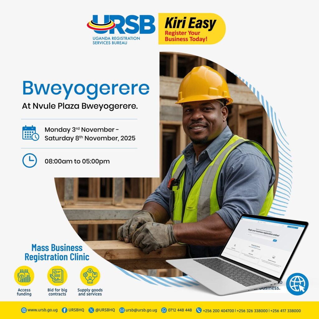 The Uganda Registration Services Bureau (URSB) continues its nationwide mass business registration initiative, with the next phase of registration clinics set to take place in Bweyogerere Division – at Nvule Plaza and Kajjansi at the Agridebt building. The clinics in these areas will take place starting Monday, 3rd to 8th November, 2025.