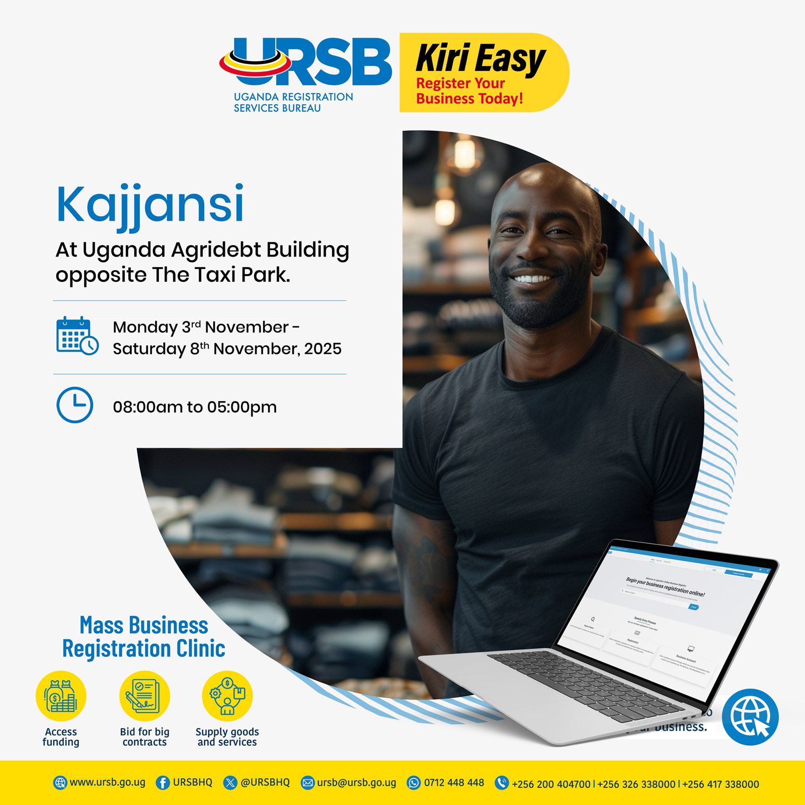The Uganda Registration Services Bureau (URSB) continues its nationwide mass business registration initiative, with the next phase of registration clinics set to take place in Bweyogerere Division – at Nvule Plaza and Kajjansi at the Agridebt building. The clinics in these areas will take place starting Monday, 3rd to 8th November, 2025.