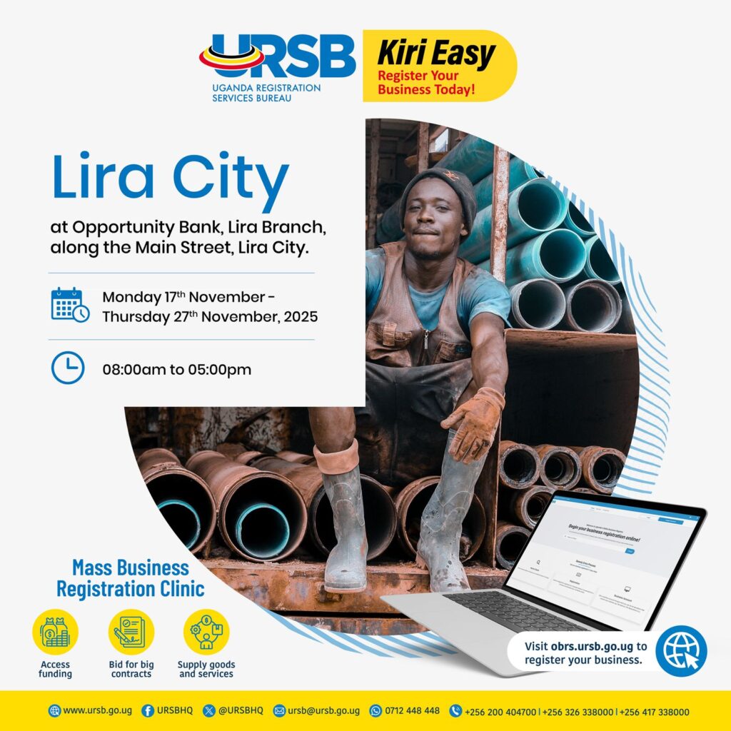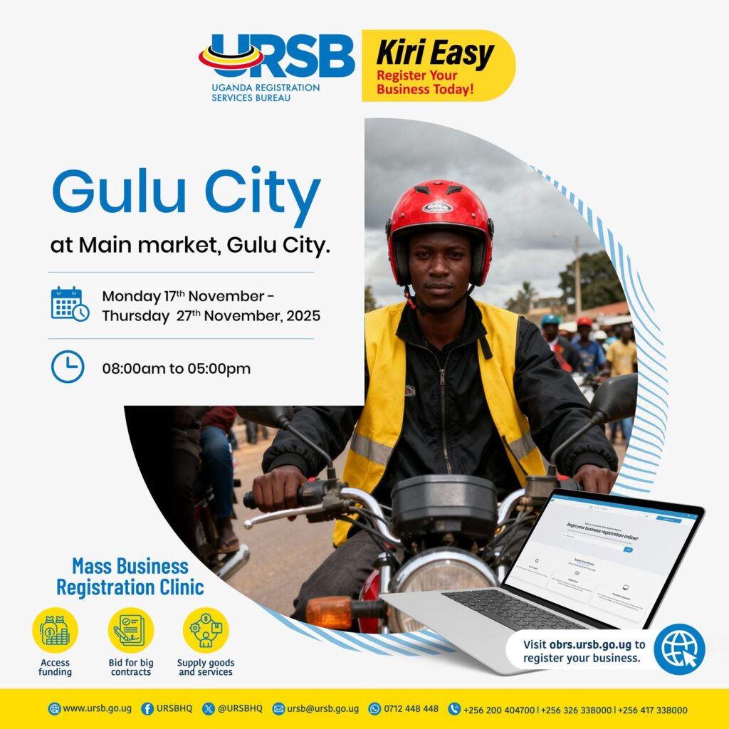 The Uganda Registration Services Bureau (URSB) continues its nationwide mass business registration initiative, with the next phase of registration clinics set to take place in Lira and Gulu. The clinics in these areas will take place starting Monday, 17th November, to November 27th, 2025.