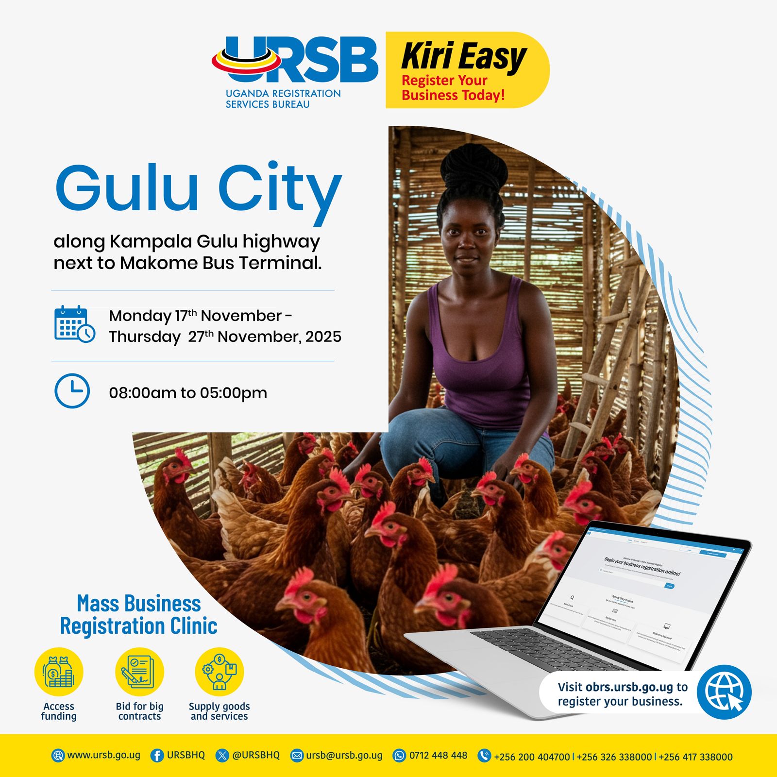 The Uganda Registration Services Bureau (URSB) continues its nationwide mass business registration initiative, with the next phase of registration clinics set to take place in Lira and Gulu. The clinics in these areas will take place starting Monday, 17th November, to November 27th, 2025.